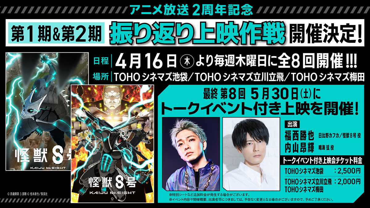 そして、最終の第8回には、5月30日(土)に日比野カフカ/怪獣8号役:福西勝也と鳴海弦役:内山昂輝が登壇するトークイベントを実施!キャストとともに放送からの2年間を振り返ります。防衛隊と怪獣の大迫力の戦いを劇場で体感できる機会を、ぜひお楽しみに。